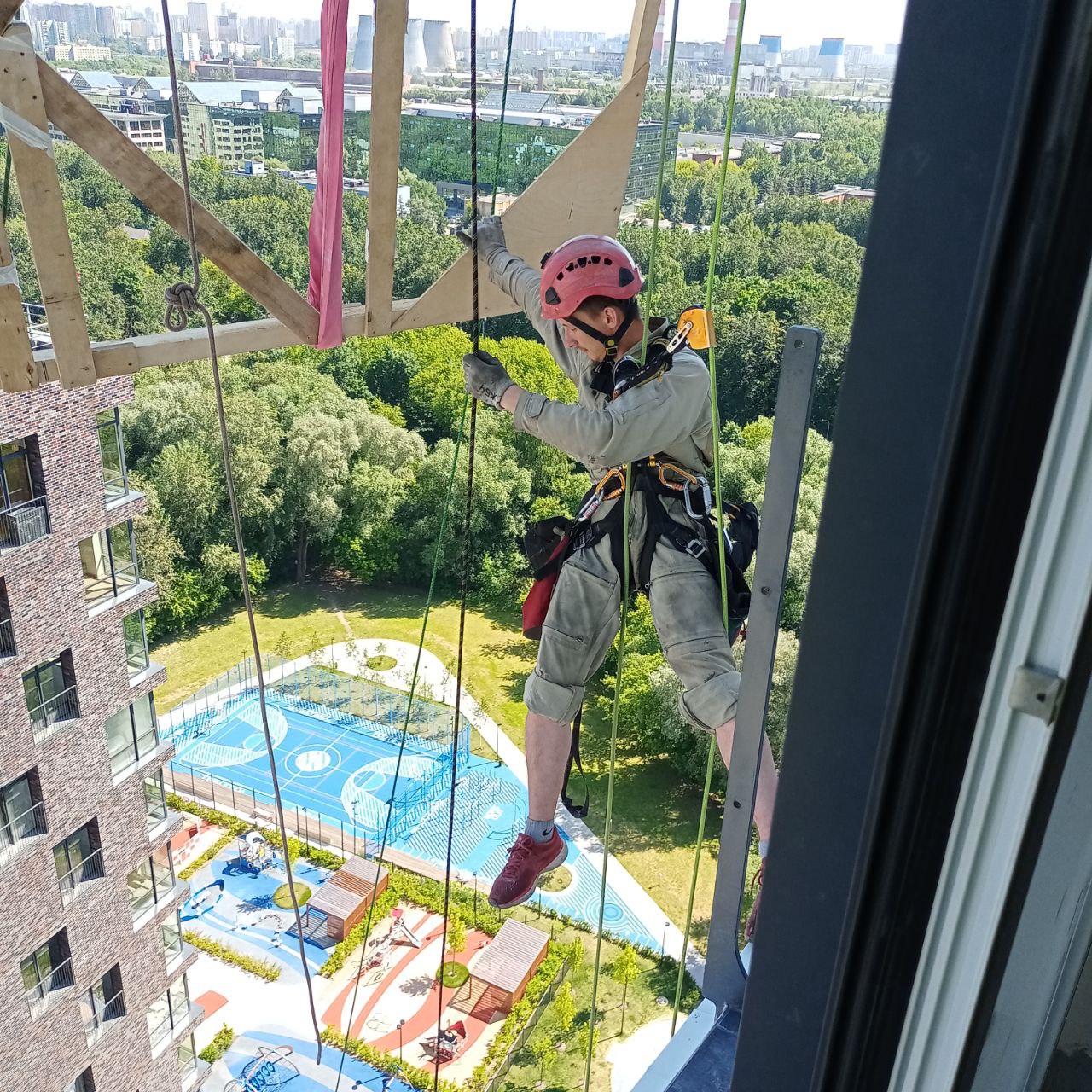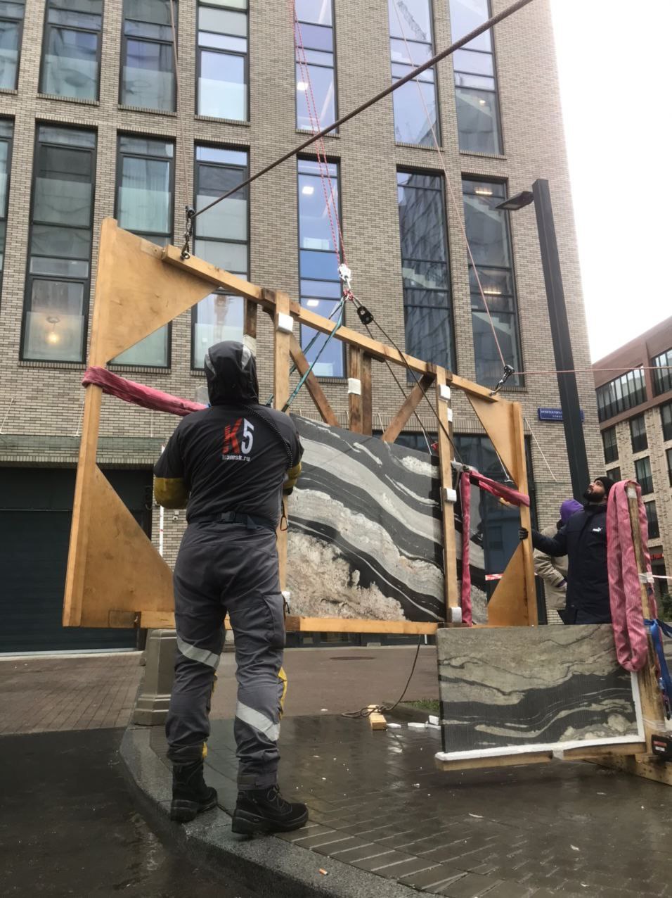 Команда промышленных альпинистов К5 успешно выполнила комплекс работ по подъёму и перемещению плит керамогранита для интерьерных решений в жилом комплексе «Кутузовский».